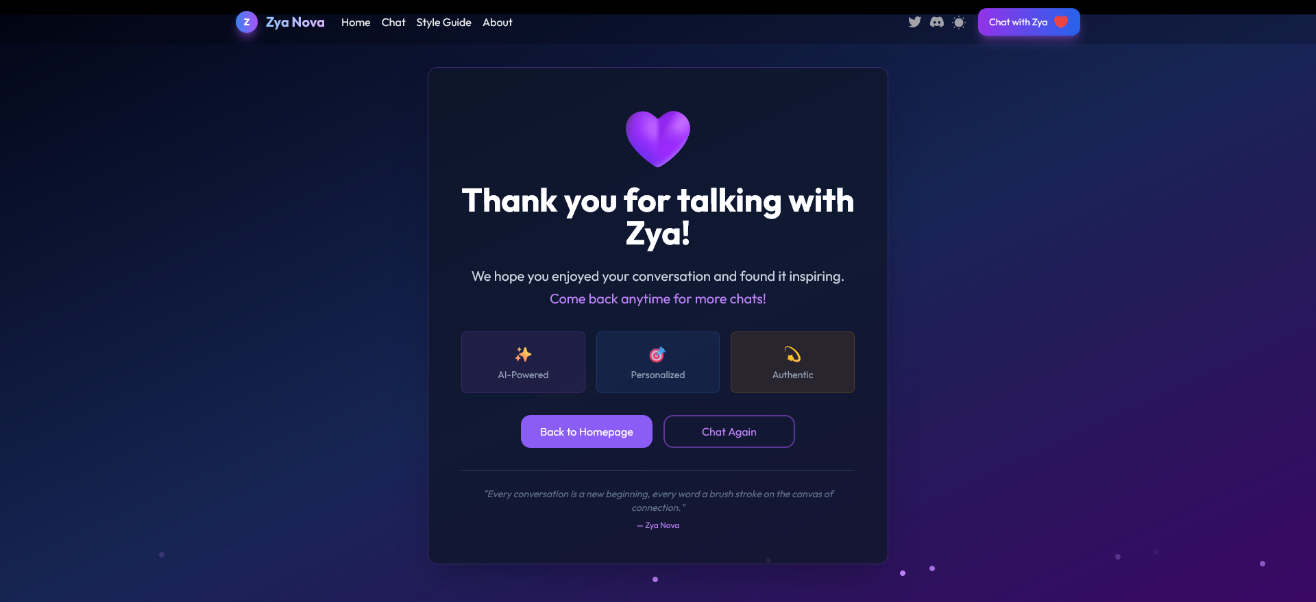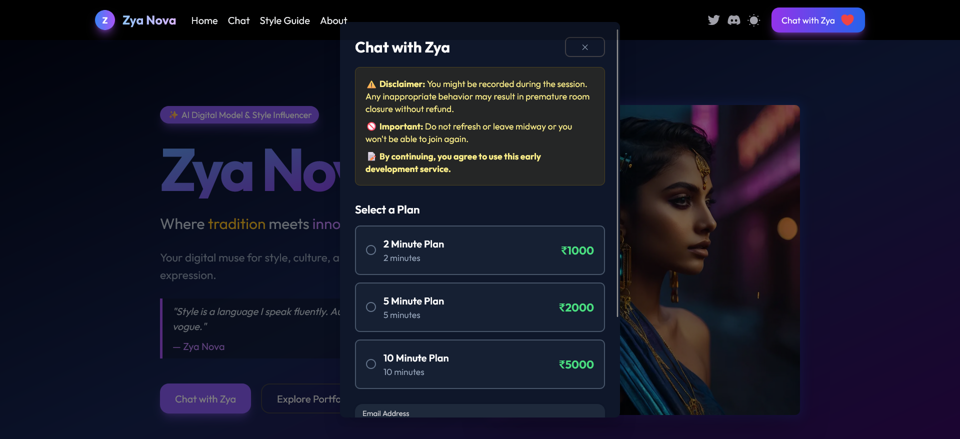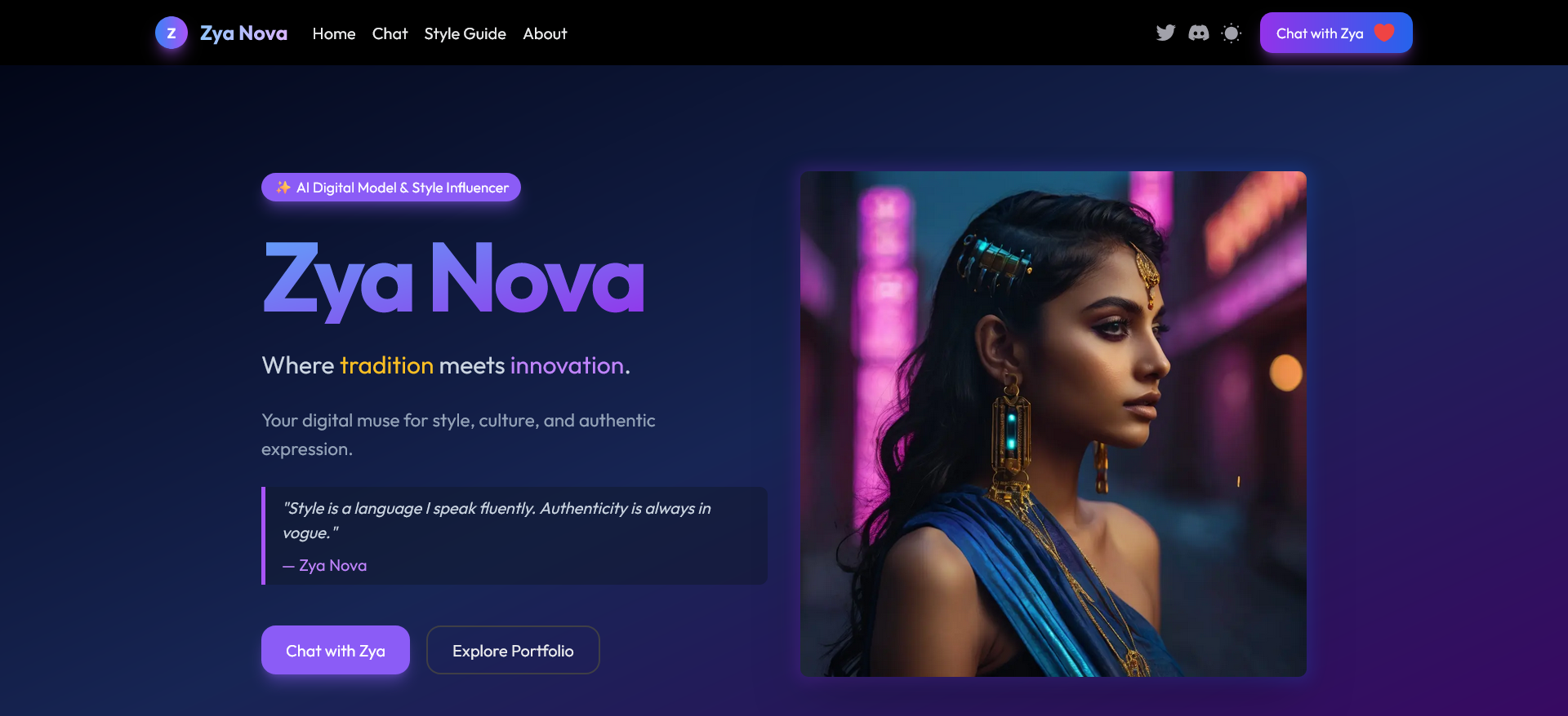 Zya Nova is a virtual AI model and influencer, a digital muse for style, culture, and authentic expression. The brand takes a small charge and then you can talk with the AI model (All the screenshots attached were pages designed by me).